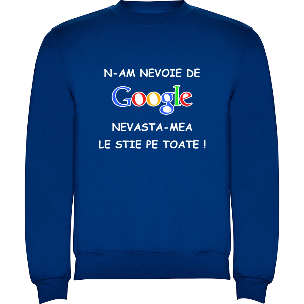 Pulover personalizat ‘NU AM NEVOIE DE GOOGLE’ – un produs versatil, creat pentru tine.